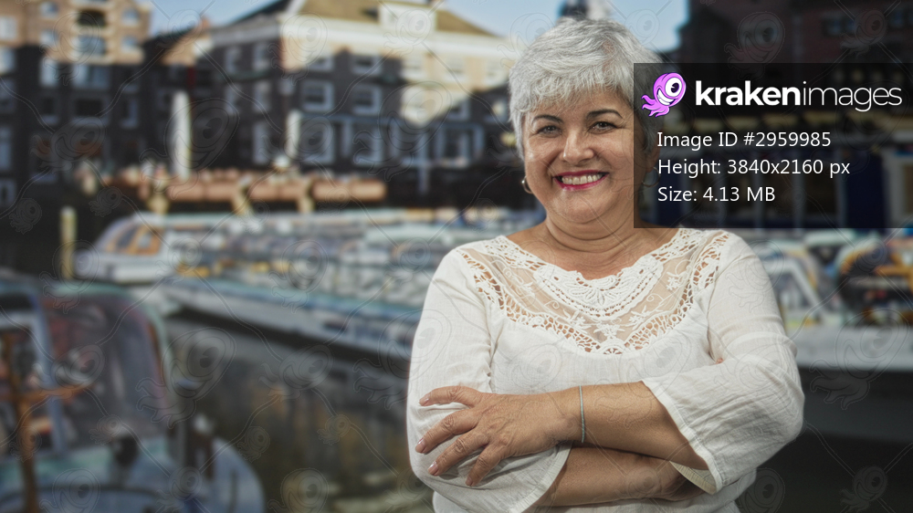Woman with crossed arms and visible hands smiling in front of canal boats and historic building; warm confidence.