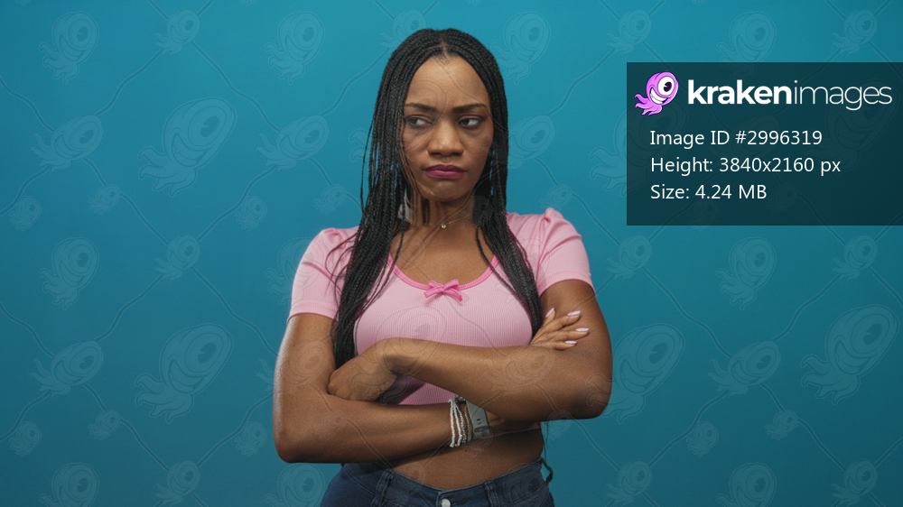 Woman with crossed arms and visible midriff in pink top in studio, looking sideways with a skeptical expression; defiance annoyance.