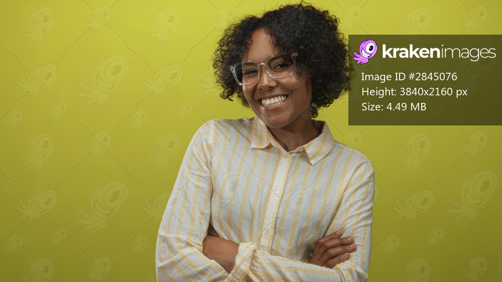 Woman with crossed arms wearing glasses and striped shirt stands against yellow wall in studio; confidence.