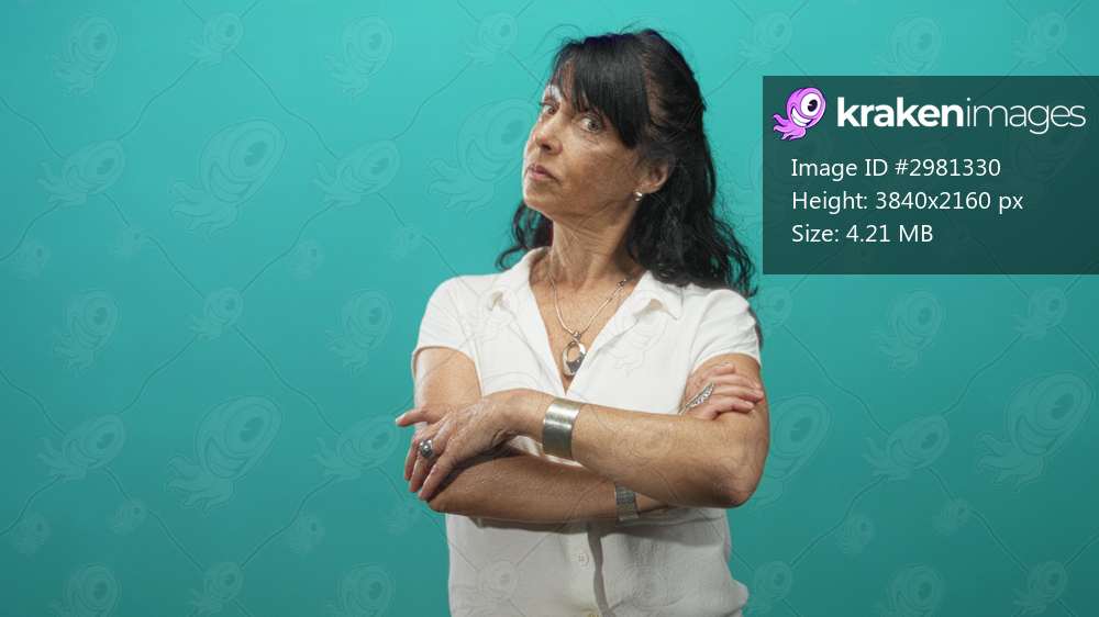 Woman with crossed arms wearing white blouse, silver cuff and rings looks upward with a thoughtful gaze in studio; pensive reflection.