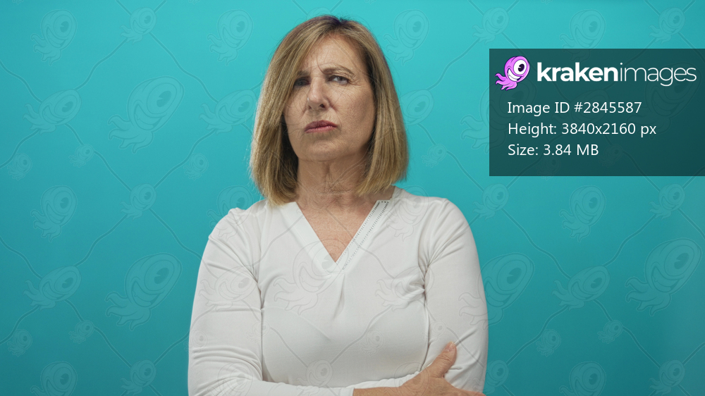 Woman crosses arms and frowns in studio with turquoise background; skepticism doubt denial rejection.