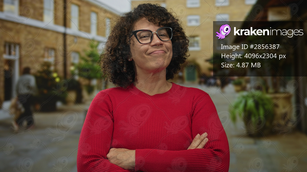 Woman crosses arms in red sweater on courtyard street in front of brown brick building with potted plants; confidence.