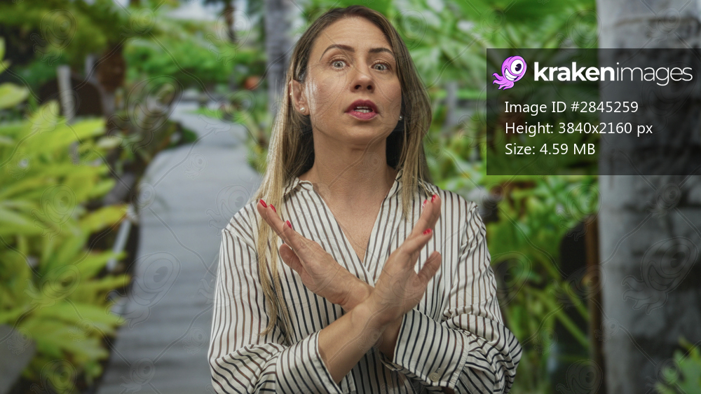 Woman crosses arms near chest on wooden forest walkway with lush green foliage and sunlight filtering; defiance rejection.