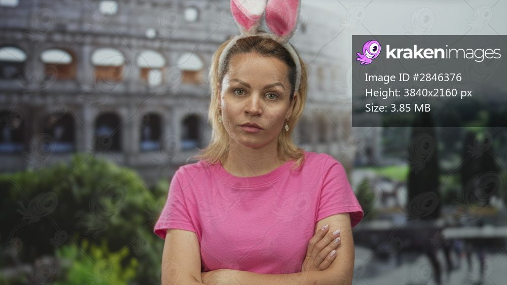 Woman crosses arms while wearing bunny ears headband at ancient roman coliseum building under sunlight; rejection.