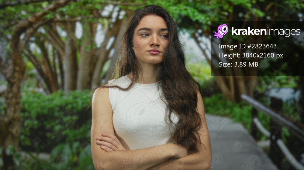 Woman crosses bare arms on forest path while gazing aside with side glance and serious expression; rejection.