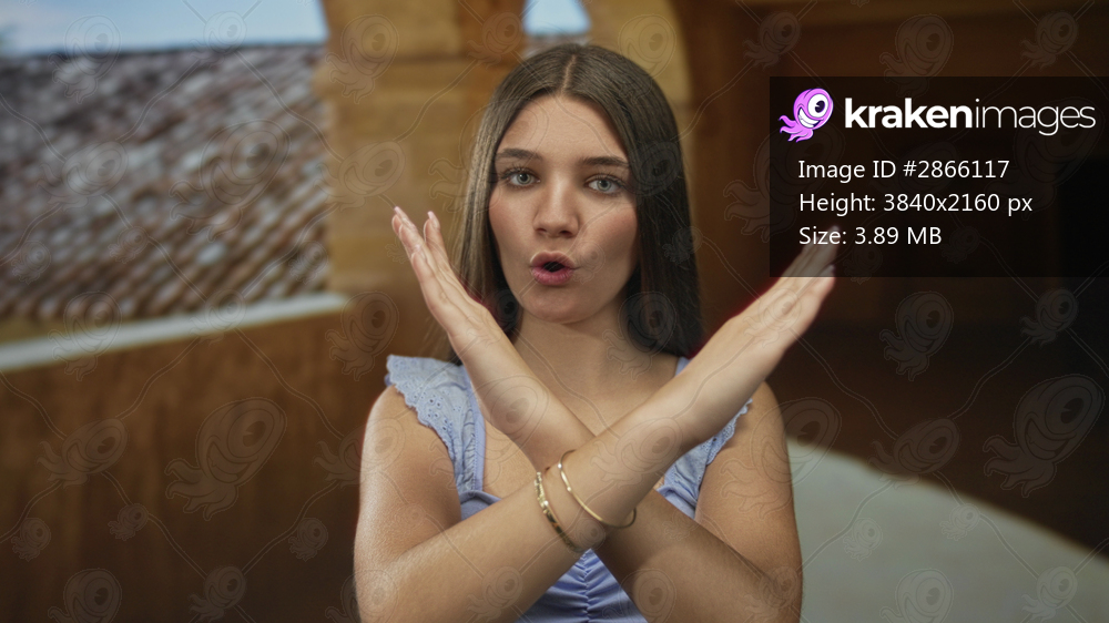 Woman crosses bare hands at chest level in an arched stone corridor lit by golden sunlight in an old town building; rejection.
