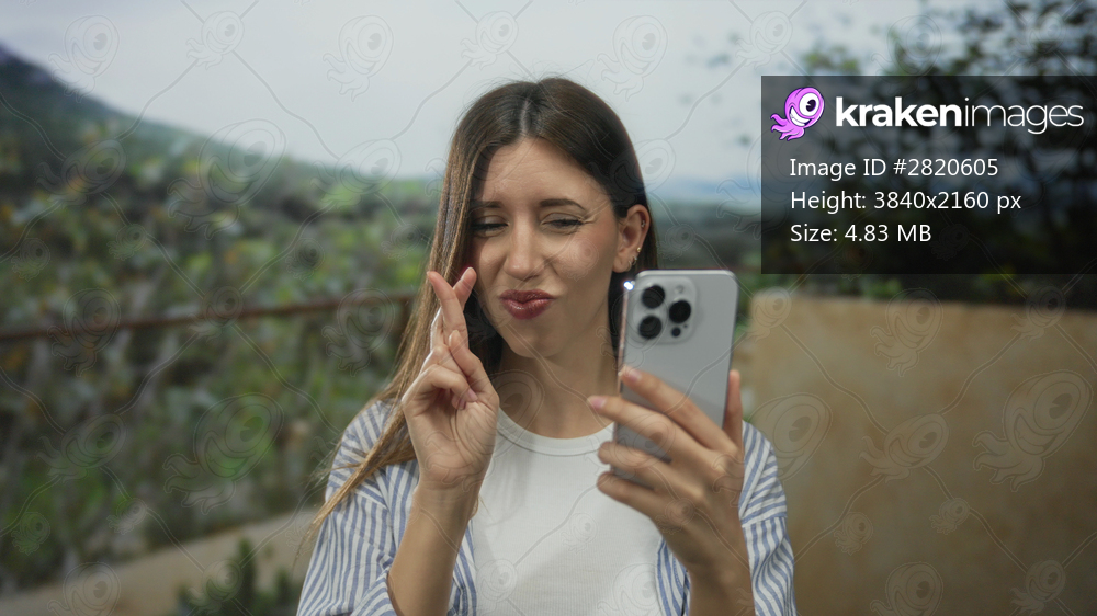 Woman crosses fingers holding smartphone in park outdoors with leafy trees and sky in background; optimism.