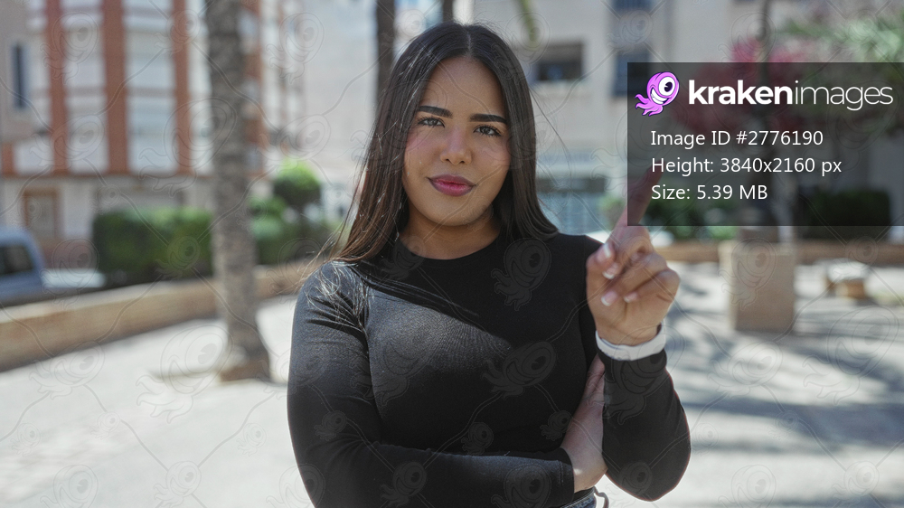 Woman crosses her arms in a denial gesture on a street with young latin hispanic appearance standing outdoors beside a smartwatch and wearing casual attire. - Kraken Images