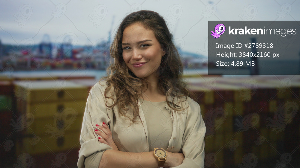 Woman crosses her arms on a street near colorful cargo containers at a port dock under overcast sky; denial.