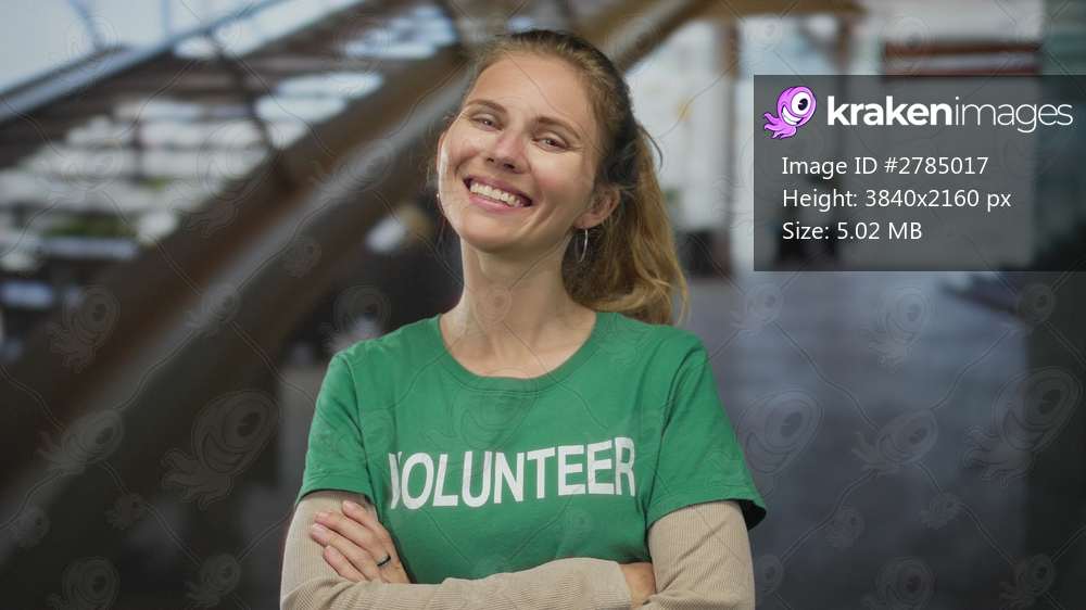 Woman crosses her arms, smiling in an office as a volunteer who is a blonde young wearing a green crossed tshirt.