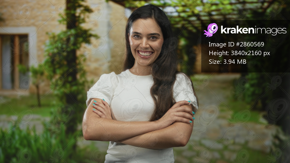 Woman crossing arms at building entrance showing bare forearms and long hair with a warm smile and relaxed posture; confidence.