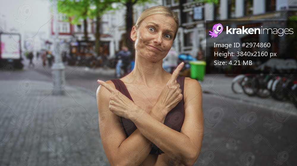 Woman crossing arms with fingers pointing upward on a city street, wearing sports bra and ponytail; confidence curiosity.
