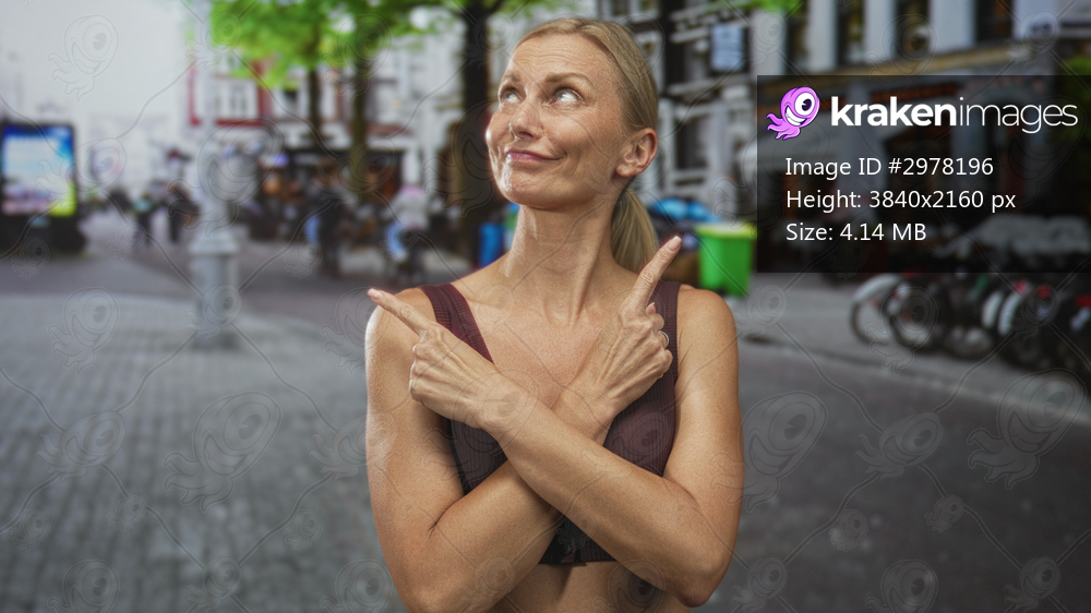 Woman crossing arms with fingers pointing upward on a city street, wearing sports bra and ponytail; confidence curiosity.