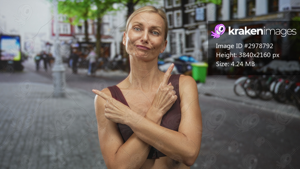 Woman crossing arms with fingers pointing upward on a city street, wearing sports bra and ponytail; confidence curiosity.