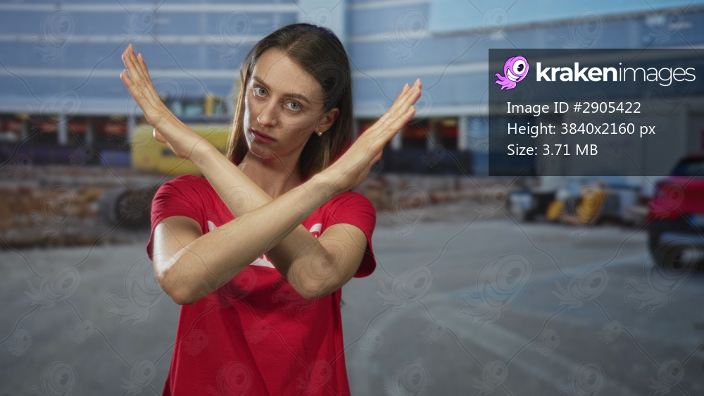 Woman crossing arms with forearms crossed in front of construction building wearing red shirt; safety protest rejection.