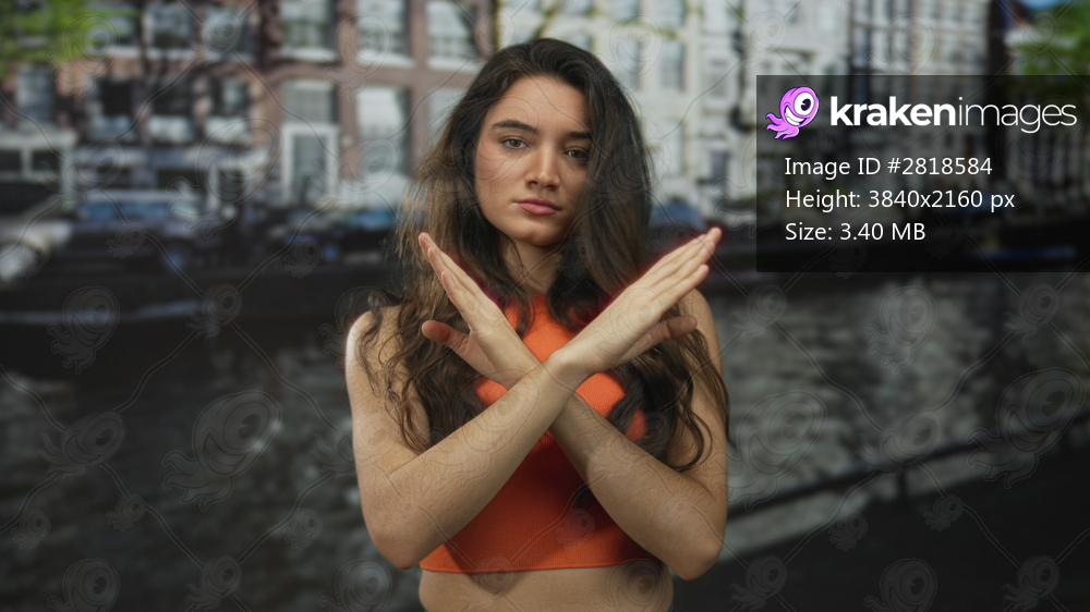 Woman crossing arms in an x gesture on a cobblestone street beside a canal lined with historic buildings; rejection.