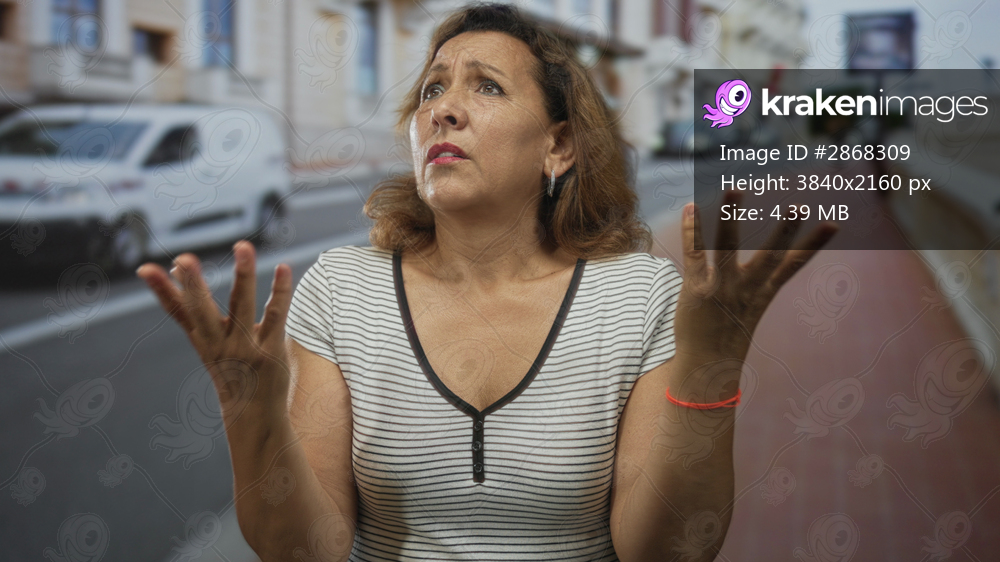 Woman crossing arms on city street near car wearing striped shirt and hoop earrings in summer; uncertainty.