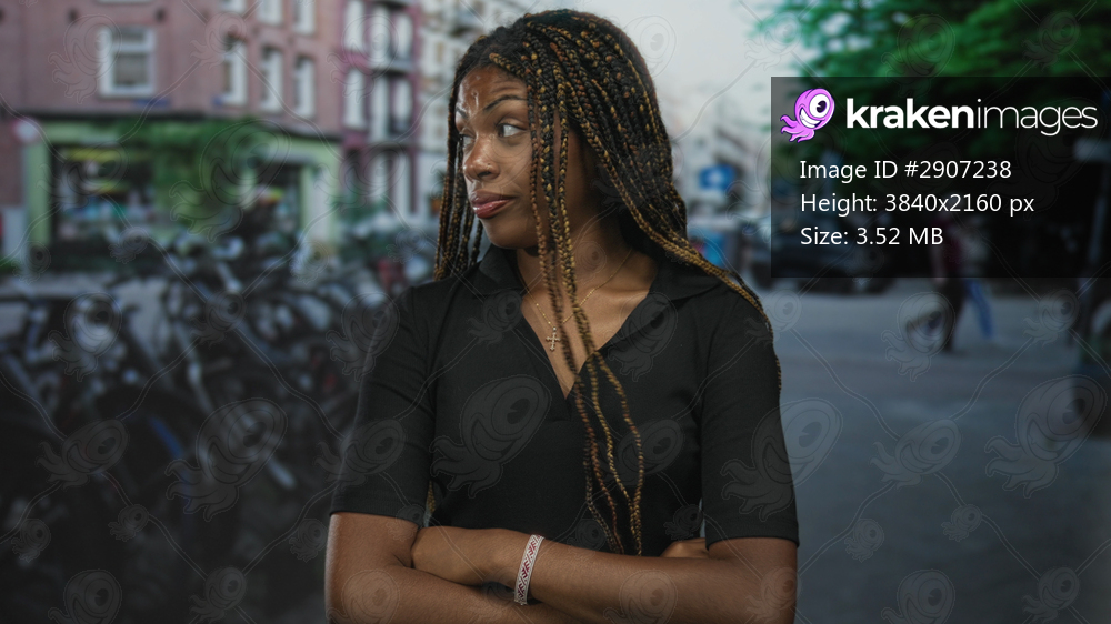 Woman crossing arms and pointing fingers on a busy city street lined with parked bicycles and cars; doubt question.