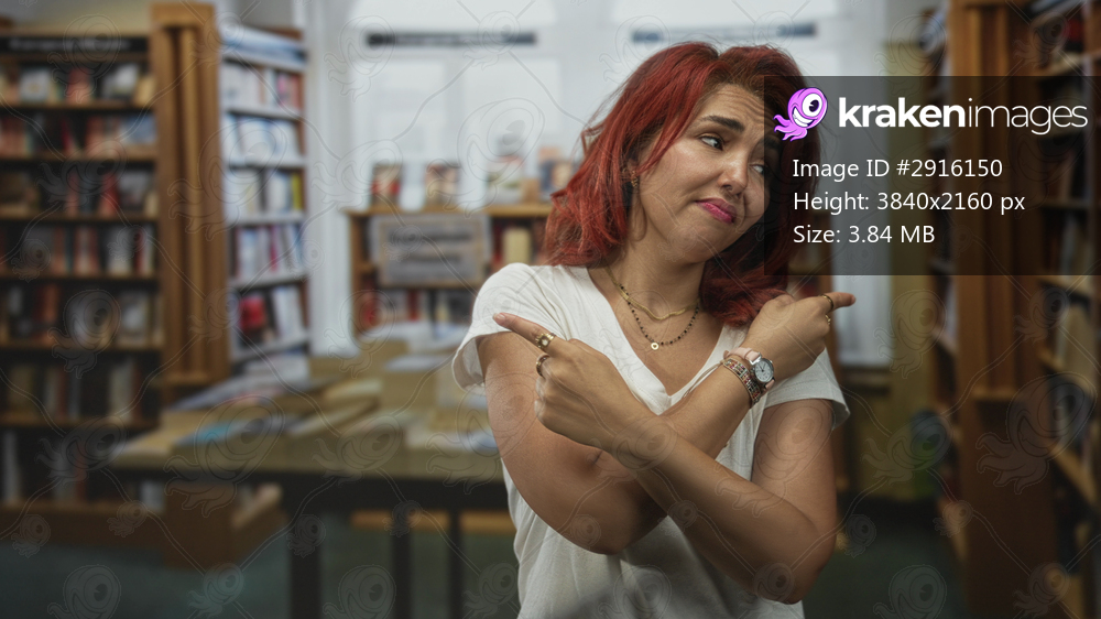 Woman crossing arms and pointing index fingers to opposite sides in a library building with bookshelves visible; indecision dilemma.