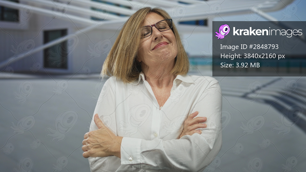 Woman crossing arms with right hand sweeping gesture outdoors in front of white building under sunlight; confidence.