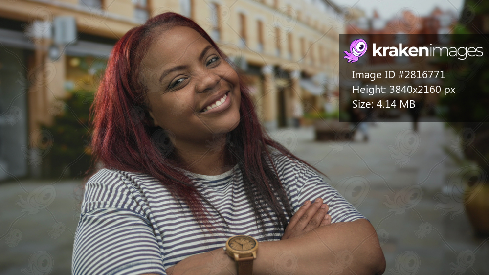 Woman crossing arms and smiling broadly on paved city street with shops and planters in view; happiness.