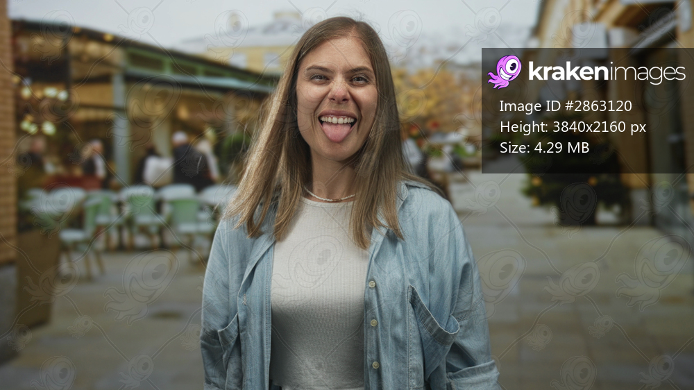 Woman crossing bare forearms on terrace in denim shirt with broad grin under soft daylight amid rows of empty chairs; defiance.