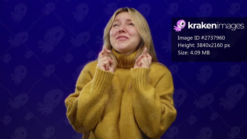 Woman crossing fingers while looking up in hope against a vivid blue background, expressing anticipation and optimism in a yellow sweater.
