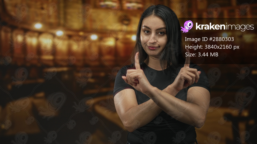 Woman crossing forearms in an x with raised index fingers inside a church building, facing camera; rejection.