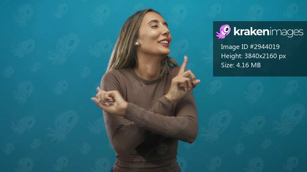 Woman crossing hands with fingers crossed and pointing in a teal studio, smiling toward camera; playfulness joy confidence.