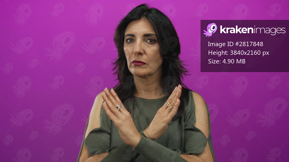 Woman crossing hands in a vibrant purple studio setting near center frame with even lighting; denial.