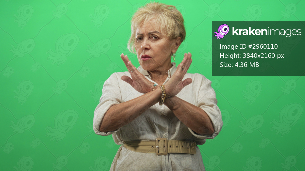 Woman crossing hands in x gesture in green studio with hands across chest, wearing white shirt and tan belt; defiance boundary.
