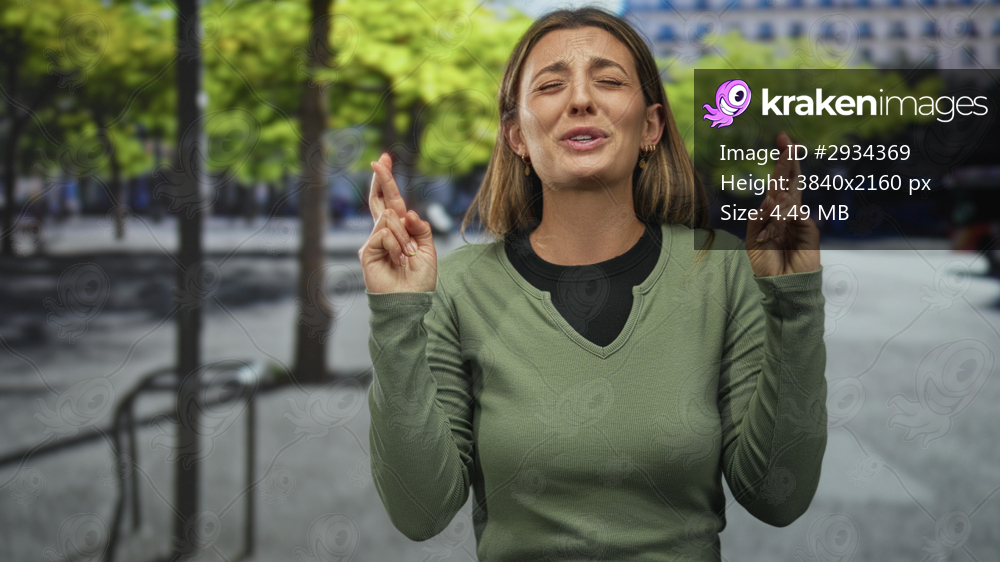 Woman crossing her fingers with eyes closed on a city street lined with trees and bike racks, wearing green sweater and smiling while waiting for luck; hopeful wish. - Kraken Images