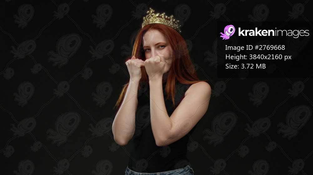 Woman with crown posing playfully against black background, representing beauty and confidence with her charming expression and elegant gestures.