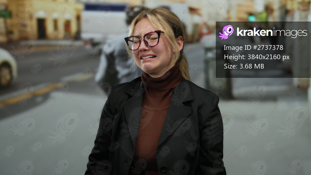 Woman crying emotionally on a bustling city street while wearing glasses and a dark coat, surrounded by blurred pedestrians and urban vehicles in the background. - Kraken Images