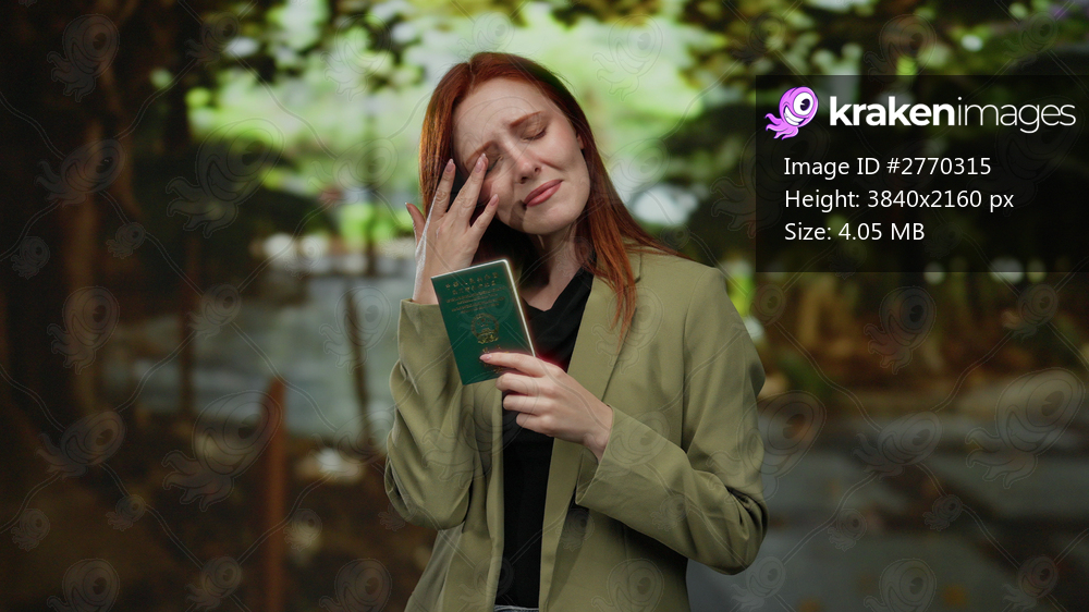 Woman crying holding chinese passport outdoors on city street, expressing emotion amidst greenery, wearing a green jacket, emphasizing travel and identification issues. - Kraken Images
