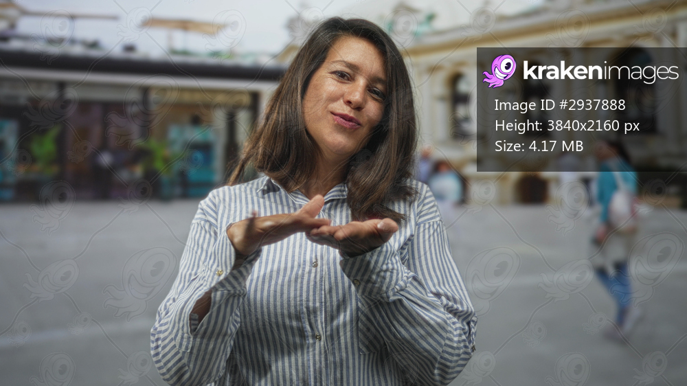 Woman with cupped hands offering gesture and smiling in a public plaza in front of ornate building; friendliness.