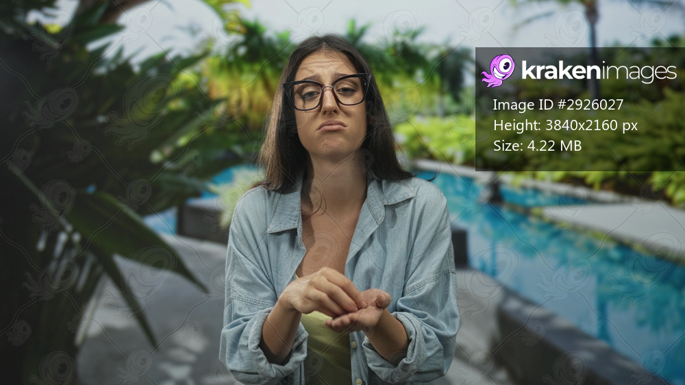 Woman with cupped hands and palms up gesture at hotel pool, wearing glasses and denim shirt, pouting expression; disappointment.