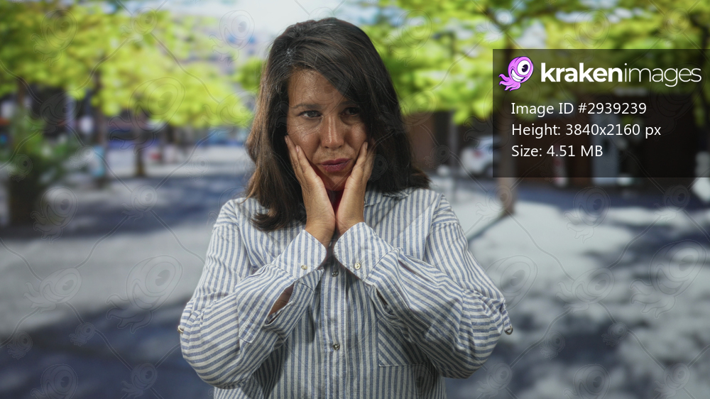 Woman cupping cheeks with both hands while standing on a sunlit street lined with trees, parked cars and a building entrance; contemplation.