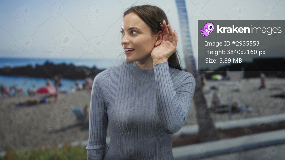 Woman cupping ear with hand in ribbed sweater on beach promenade street near palm and sea, looking to side; curiosity.