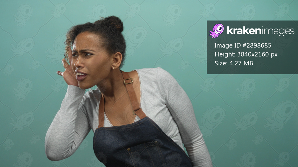 Woman cupping ear with hand and leaning forward wearing denim apron in teal studio; curiosity listening.