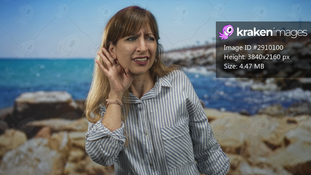 Woman cupping ear with hand and squinting and leaning forward wearing striped shirt and hoop earring in studio seaside rocks; confusion listening.