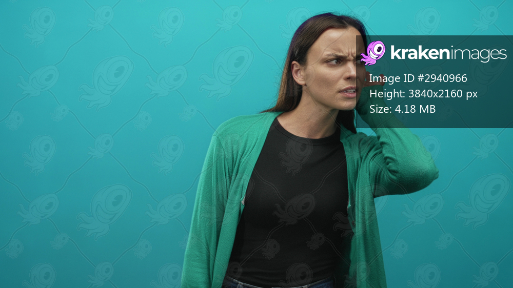 Woman cupping ear with hand wearing green cardigan in studio with teal backdrop; listening skepticism.