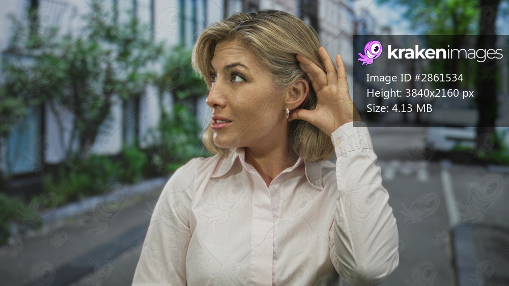 Woman cupping ear in listening gesture wearing pale pink blouse on urban street; curiosity exploration.