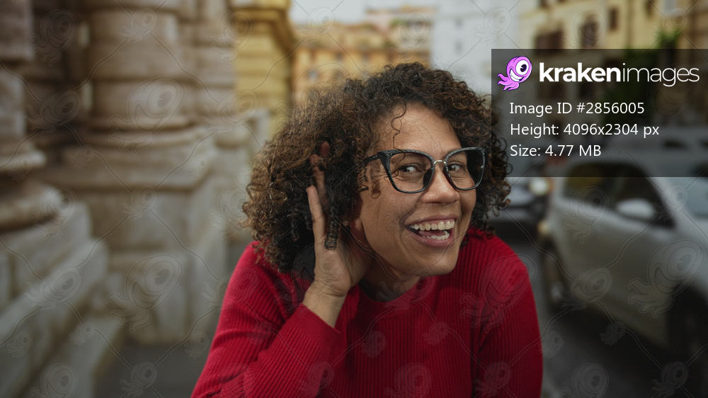 Woman cupping ear on street beside stone building entrance, smiling attentively; curiosity discovery.