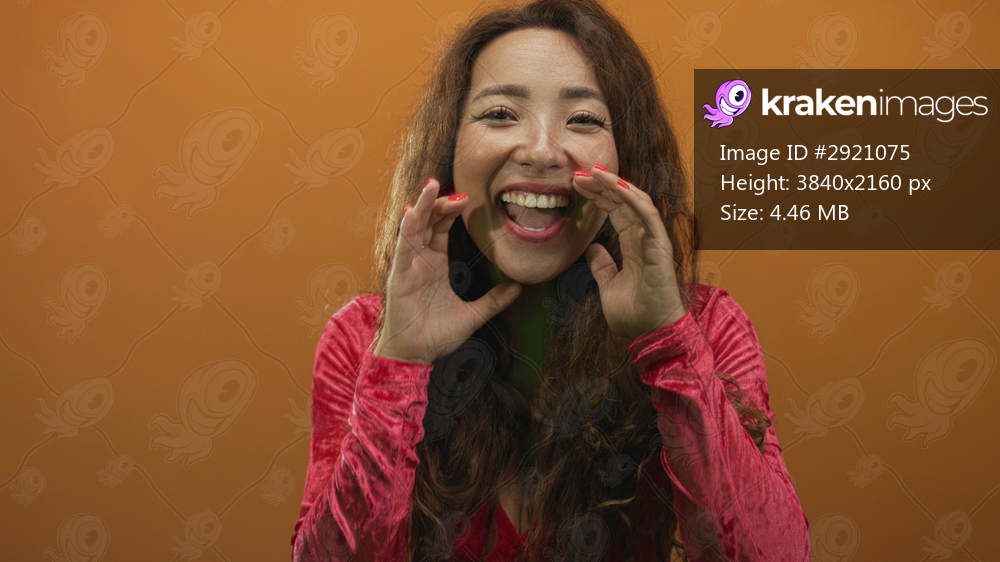 Woman cupping hand at mouth shouting and smiling in orange studio wearing pink velvet dress with visible hands and long hair; joy celebration.