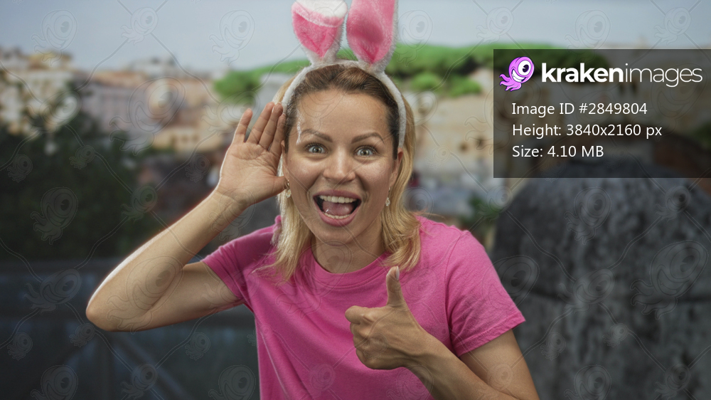 Woman cupping hand to ear in bunny ears headband at roman ruins building in italy outdoors; curiosity exploration.
