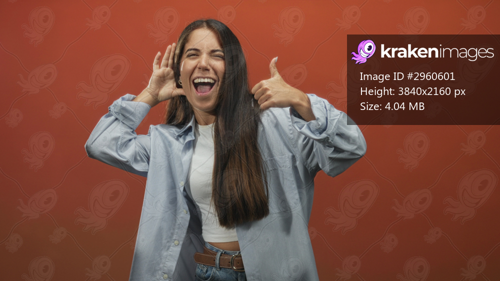 Woman cupping hand to ear and smiling with open mouth in a studio, playful listening and thumbs up moment; excitement curiosity.