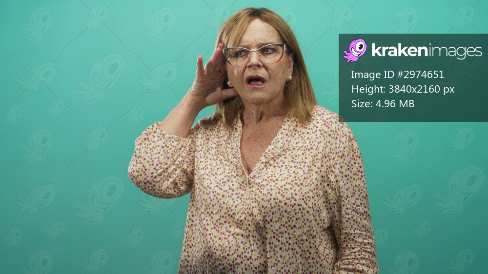 Woman cupping hand to ear and squinting behind glasses in a studio teal backdrop; hearing difficulty concern.