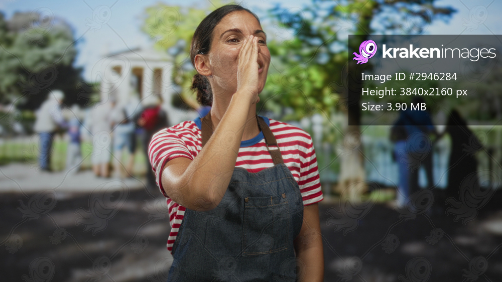 Woman cupping hand to mouth calling out in park near lake and trees, wearing striped shirt and denim apron; enthusiasm community connection.