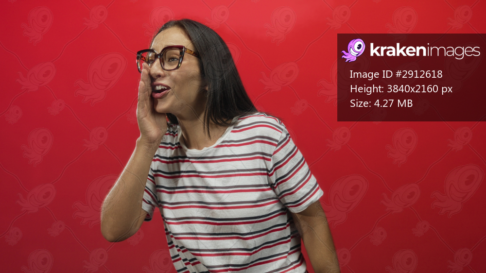 Woman cupping hand to mouth in red studio wearing striped shirt and glasses; cheerful secret sharing surprise.